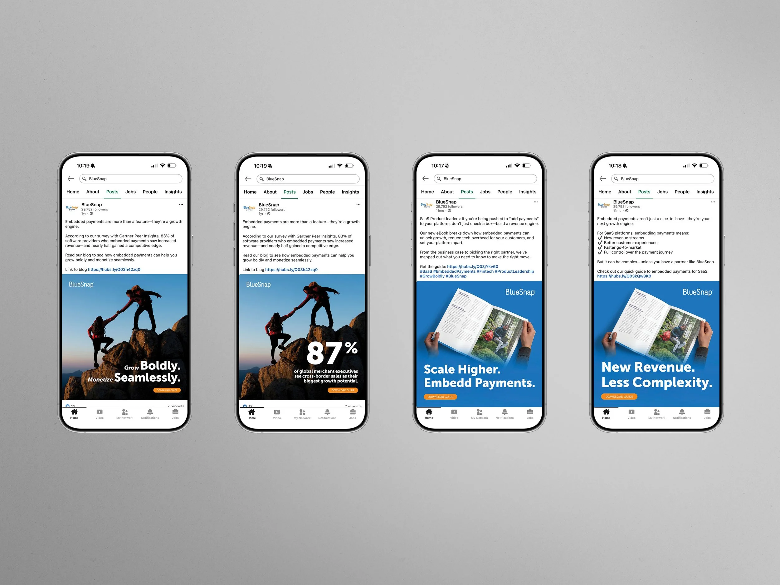 I led creative from concept through production and building out the full campaign ecosystem: landing page, social assets, and display ads. The visual language centered on the idea of climbing together, reinforcing that BlueSnap is the partner helping you scale.